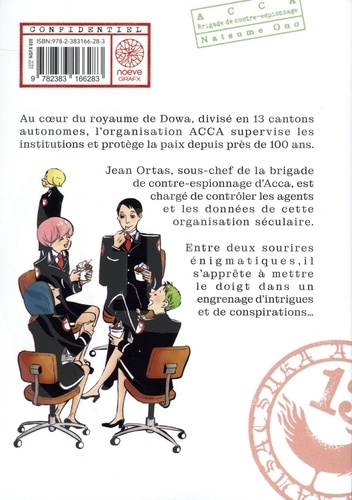 Au coeur du royaume de Dowa, divisé en 13 cantons autonomes, l'organisation ACCA supervise les institutions et protège la paix depuis près de 100 ans. Jean Ortas, sous-chef de la brigade de contre-espionnage d'Acca, est chargé de contrôler les agents et les données de cette organisation séculaire. Entre deux sourires énigmatiques,il s'apprête à mettre le doigt dans un engrenage d'intrigues et de conspirations...