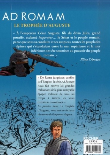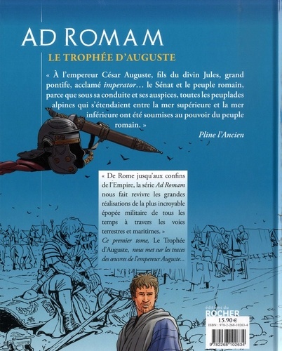 "A l'empereur César Auguste, fils du divin Jules, grand pontife, acclamé imperator... le Sénat et le peuple romain, parce que sous sa conduite et ses auspices, toutes les peuplades alpines qui s'étendaient entre la mer supérieure et la mer inférieure ont été soumises au pouvoir du peuple romain". Pline l'Ancien De Rome jusqu'aux confins de l'Empire, la série Ad Romam nous fait revivre les grandes réalisations de la plus incroyable épopée militaire de tous les temps à travers les voies terrestres et maritimes. Ce premier tome, Le Trophée d'Auguste, nous met sur les traces des oeuvres de l'empereur Auguste...