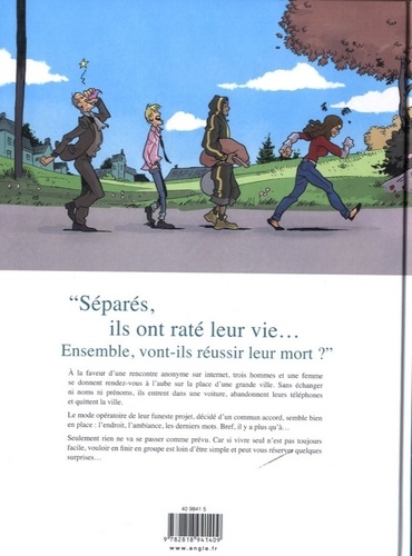 Séparés, ils ont raté leur vie... Ensemble, vont-ils réussir leur mort ? A la faveur d'une rencontre anonyme sur internet, trois hommes et une femme se donnent rendez-vous à l'aube sur la place d'une grande ville. Sans échanger noms ni prénoms, ils entrent dans une voiture, abandonnent leurs téléphones et quittent la ville. Le mode opératoire de leur funeste projet, décidé d'un commun accord, semble bien en place : L'endroit, l'ambiance, les derniers mots. Bref, il y a plus qu'à... Seulement rien ne va se passer comme prévu. Car si vivre seul n'est pas toujours facile, vouloir en finir en groupe est loin d'être simple et peut vous réserver quelques surprises...
