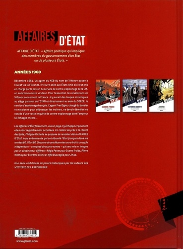 Espionnage et contre-espionnage. Affaire d'état : "affaire politique qui implique des membres du gouvernement d'un Etat ou de plusieurs Etats" . Elles foisonnent, aucun pays n'y échappe et pourtant elles sont régulièrement occultées. S'inspirant librement de la réalité des faits, Philippe Richelle se propose de revisiter dans Affaires d'Etat, trois événements qui ont ébranlé l'Etat français dans les années 60, 70 et 80. Chacune de ces décennies aura le droit à un cycle indépendant - composé de quatre tomes - qui sera mis en images par un dessinateur différent : Régis Penet pour Guerre froide, Pierre Wachs pour Extrême droite et Alfio Buscaglia pour Jihad. Une série-concept ambitieuse de polars historiques et d'espionnage soutenue par une publication exceptionnelle puisque les trois premiers tomes sortiront le même jour. Décembre 1961. Un agent du KGB du nom de Trifonov passe à l'ouest via la Finlande. Il trouve asile aux Etats-Unis où il est pris en charge par le patron du service de contre-espionnage de la CIA, un anticommuniste virulent. Pour l'essentiel, les révélations de Trifonov concernent la France : il y aurait des taupes soviétiques au siège de l'OTAN àParis et au sein du SDECE, le service d'espionnage français. L'agent Fred Ogier, chargé du dossier et missionné pour débusquer les traitres, va devoir démêler les noeuds d'une vaste enquête de contre-espionnage dont l'ampleur lui échappe encore...