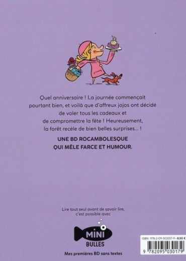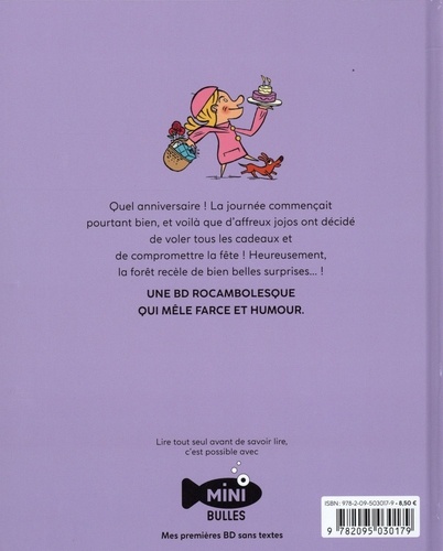 Une BD rocambolesque qui mêle farce et humour ! L'histoire : Quel anniversaire ! La journée commençait pourtant bien, et voilà que d'affreux jojos ont décidé de voler tous les cadeaux et de compromettre la fête ! Heureusement, la forêt cache bien des surprises ! La collection Minibulles : les petits entrent naturellement dans les livres par les images : sans le soutien du texte, les images portent toutes les étapes du récit sans l'ellipse narrative. Sans texte, chacun est libre de se raconter l'histoire comme il le souhaite : à partir des images, l'enfant passe à l'oral et fait des phrases pour vous raconter l'histoire ou lire seul.