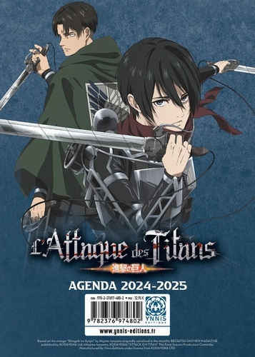 Passez l'année scolaire avec vos héros préférés de L'Attaque des titans. Une page par jour de septembre 2024 jusqu'à l'été 2025, avec des espaces pour vos notes, rendez-vous, dates importantes : votre agenda vous suivra partout ! En bonus : une planche de stickers L'Attaque des titans. 6 pages par semaine, un mini-calendrier par mois, des pages de notes, des infos pratiques et de nombreuses illustrations tirées de la licence pour vous accompagner toute l'année.