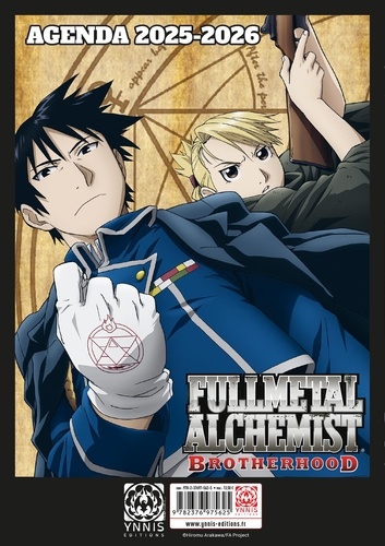Une page par jour de la semaine, de nombreuses illustrations de la série, de la place pour noter vos activités scolaires ou professionnelles ! En voulant ressusciter leur mère, Edward et Alphonse Elric vont utiliser une technique interdite relevant du domaine de l'alchimie : la transmutation humaine. Seulement, l'expérience va mal tourner : Edward perd un bras et une jambe et Alphonse son corps, son esprit se retrouvant prisonnier d'une armure. Devenu un alchimiste d'Etat, Edward, surnommé "fullmetal alchimiste" , se lance, avec l'aide de son frère, à la recherche de la pierre philosophale, leur seule chance de retrouver leur état initial.