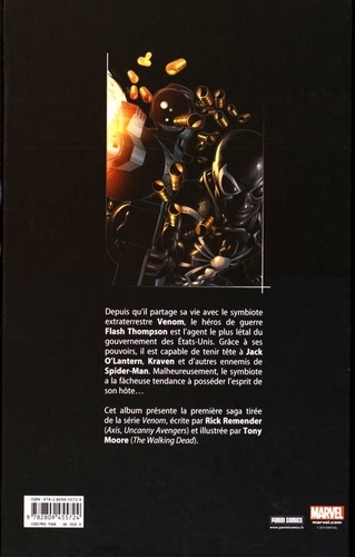Depuis qu'il partage sa vie avec le symbiote extraterrestre Venom, le héros de guerre Flash Thompson est l'agent le plus létal du gouvernement des Etats-Unis. Grâce à ses pouvoirs, il est capable de tenir tête à Jack O'Lantern, Kraven et d'autres ennemis de Spider-Man. Malheureusement, le symbiote a la fâcheuse tendance à posséder l'esprit de son hôte... Cet album présente la première saga tirée de la série Venom, écrite par Rick Remender (Axis, UncannyAvengers) et illustrée par Tony Moore (The Walking Dead).