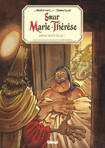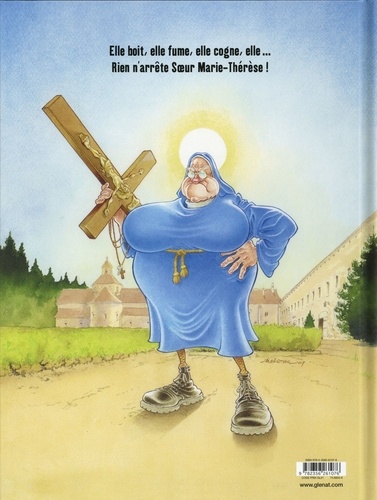 Priez pour nous : la revoilà ! Arrêtée par la police pour terrorisme, Soeur Marie-Thérèse comparait devant un tribunal. Mais avec une liste de chefs d'accusation plus épaisse que la Bible en 5 volumes et un avocat qui se dérobe au dernier moment, la belle est bonne pour aller en cellule - et pas celle du couvent cette fois ! A moins d'un miracle venu de Jésus lui-même... Dix ans ! Dix ans que Soeur Marie-Thérèse, Notre Dame de la bande dessinée qui brûle tout sur son passage, nous avait laissés orphelins de son franc-parler, de son caractère bien trempé (dans l'alcool) et de ses directs du droit bien sentis. En cause : notamment d'importants problèmes de santé qui ont convaincu l'inénarrable (mais pas inaltérable) Maëster d'associer Julien Solé au dessin pour terminer l'album. Loin d'un testament (ancien ou nouveau), cet album à quatre mains s'avère être le geste courageux d'un artiste qui, face aux épreuves de la vie, préfère trouver la rédemption dans l'humour et l'amitié.