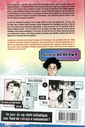 La nouvelle étoile du manga entre en scène ! Pour la jeune Akane, son père Toru est doté d'un incroyable pouvoir : assis seul sur scène, il est capable de donner vie à une multitude de personnages différents, armé uniquement d'un éventail et d'un carré de tissu ! Toru pratique le rakugo, une forme de spectacle humoristique populaire née il y a des centaines d'années, mais toujours vivante. Malgré les moqueries de son entourage, il rêve d'accéder au rang de maître. La pression est d'autant plus forte qu'il ne veut pas décevoir sa femme, soutien de toujours, ni surtout sa fille Akane... Elle l'admire au point de l'imiter, répétant les scènes de rakugo en cachette ! Le jour de l'examen de passage vers le grade ultime, la barre est placée haut : ce n'est rien de moins que le célèbre Issho Arakawa, maître incontesté de la discipline, qui joue le rôle de juré. Toru donne une performance remarquable, la salle se tord de rire ! Et pourtant, Issho le déclare indigne du titre... Pire, il le bannit à vie du monde du rakugo, ainsi que tous les autres candidats, sans aucune explication ! La carrière d'artiste de Toru est brisée, sans que personne n'en comprenne la raison... mais Akane reprend le flambeau, bien décidée à réaliser son rêve et à découvrir la vérité derrière ce scandale ! Acclamé par les plus grands noms du manga et de l'animation, tels qu'Eiichiro Oda (One Piece) ou Hideaki Anno (Neon Genesis Evangelion), Akane-banashi est un véritable phénomène dès le début de sa publication dans le mythique Shonen Jump (My Hero Academia, Jujutsu Kaisen...) ! Nul ne peut rester insensible à l'énergie communicative d'Akane, cette héroïne ultra-moderne adepte d'un art ancestral !