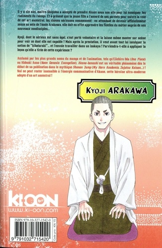 La nouvelle étoile du manga entre en scène ! Pour la jeune Akane, son père Toru est doté d'un incroyable pouvoir : assis seul sur scène, il est capable de donner vie à une multitude de personnages différents, armé uniquement d'un éventail et d'un carré de tissu ! Toru pratique le rakugo, une forme de spectacle humoristique populaire née il y a des centaines d'années, mais toujours vivante. Malgré les moqueries de son entourage, il rêve d'accéder au rang de maître. La pression est d'autant plus forte qu'il ne veut pas décevoir sa femme, soutien de toujours, ni surtout sa fille Akane... Elle l'admire au point de l'imiter, répétant les scènes de rakugo en cachette ! Le jour de l'examen de passage vers le grade ultime, la barre est placée haut : ce n'est rien de moins que le célèbre Issho Arakawa, maître incontesté de la discipline, qui joue le rôle de juré. Toru donne une performance remarquable, la salle se tord de rire ! Et pourtant, Issho le déclare indigne du titre... Pire, il le bannit à vie du monde du rakugo, sans aucune explication ! La carrière d'artiste de Toru est brisée, sans que personne n'en comprenne la raison... mais Akane reprend le flambeau, bien décidée à réaliser son rêve et à découvrir la vérité derrière ce scandale ! Acclamé par les plus grands noms du manga et de l'animation, tels qu'Eiichiro Oda (One Piece) ou Hideaki Anno (Neon Genesis Evangelion), Akane-banashi est un véritable phénomène dès le début de sa publication dans le mythique Shonen Jump (My Hero Academia, Jujutsu Kaisen...) ! Nul ne peut rester insensible à l'énergie communicative d'Akane, cette héroïne ultra-moderne adepte d'un art ancestral !