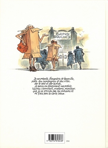 Je me présente, Alexandrin de Vanneville, poète des campagnes et des villes. Par le vent et par la pluie, je survie en proposant ma poésie. Sachez cependant, madame, monsieur, que je ne pends pas les chèques et ne fais pas la carte bleue.