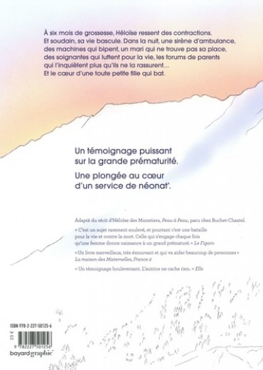 A six mois de grossesse, Héloïse ressent des contractions. Et soudain, sa vie bascule. Dans la nuit, une sirène d'ambulance, des machines qui bipent, un mari qui ne trouve pas sa place, des soignantes qui luttent pour la vie, les forums de parents qui l'inquiètent plus qu'ils ne la rassurent... Et le coeur d'une toute petite fille qui bat. Un témoignage puissant sur la grande prématurité. Une plongée au coeur d'un service de néonat'. Adapté du récit d'Héloïse des Monstiers, Peau à Peau, paru chez Buchet-Chastel.