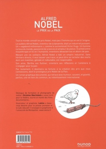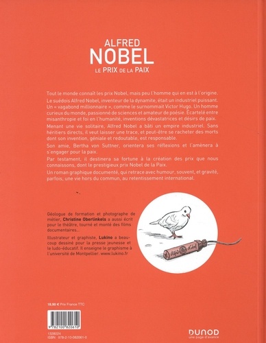 Cet ouvrage s'adresse à tous ceux qui s'interrogent sur ce paradoxe : comment un homme, un industriel qui a fait commerce de son invention, la dynamite, a-t-il pu parallèlement créer un prix pour la Paix et lui donner son nom ? Tout le monde connaît les prix Nobel. A la fin de sa vie, après avoir fait fortune, Alfred Nobel a créé un prix décerné chaque année et pour la première fois en 1901 aux personnes les plus méritantes dans cinq disciplines : physique, chimie, littérature, médecine et action pour la paix. Ce roman graphique nous raconte le parcours étrange de cet industriel globe-trotter, inventeur de la dynamite, écartelé entre sa curiosité du monde, sa soif de sciences et ses lectures poétiques ; entre ses inventions dévastatrices et ses désirs de paix ; sa misanthropie et son aisance en public ; son immense fortune et sa vie de nomade ; ses amours déchues et ses rêves d'amour, et l'omniprésence de la mort. N'ayant pas d'héritiers directs, il a souhaité laisser une trace (et peut-être se racheter des souffrances involontaires, des morts civiles et militaires qui jonchent sa route). Une femme, Bertha von Suttner, va orienter ses réflexions et ses actions pour l'humanité, vers l'espoir d'un avenir pacifié. Les convictions d'Alfred Nobel seront confortées, et parfois bousculées, par cette influence féminine. Il en résultera un testament universel et la création des prix Nobel. Des images fortes et des textes parfois décalés engagent le lecteur à la réflexion.