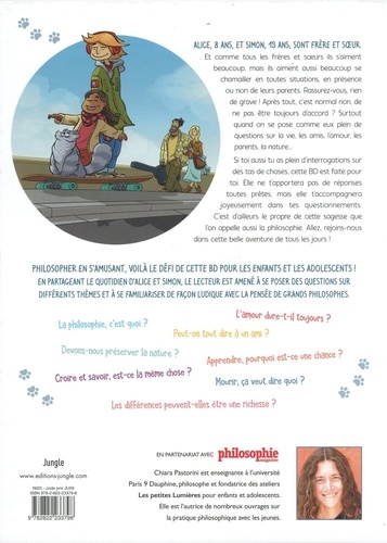 Faire ses premiers pas philosophiques... en BD ! A partir du quotidien d'un frère et une soeur, le lecteur est amené à se poser des questions sur différents thèmes philosophiques et la pensée de plusieurs grands philosophes. Dans ce premier tome, on retrouve Adèle (8 ans), Simon (11 ans) dans leur vie de tous les jours : à la maison en famille, à l'école, avec leurs amis, en vacances, confrontés à des épreuves, etc. C'est leur chat Socrate - non pas doté de parole mais dont les pensées parviennent au lecteur - qui joue le rôle de guide et invite le lecteur à s'interroger lui aussi. En donnant son point de vue de façon humoristique et toujours bienveillante sur les situations vécues par Adèle et Simon, il offre un autre niveau de lecture et permet le questionnement
