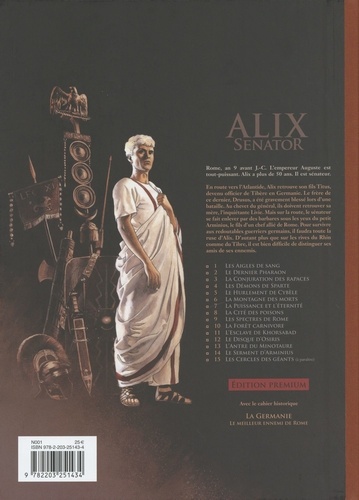 Rome an 9 avant J. -C. . L'empereur Auguste est tout-puissant. Alix a plus de 50 ans. Il est sénateur. En route vers l'Atlantide, Alix retrouve son fils Titus, devenu officier de Tibère en Germanie. Le frère de ce dernier, Drusus, a été gravement blessé lors d'une bataille. Au chevet du général, ils doivent retrouver sa mère, l'inquiétante Livie. Mais sur la route, le sénateur se fait enlever par des barbares sous les yeux du petit Arminius, le fils d'un chef allié de Rome. Pour survivre aux redoutables guerriers germains, il faudra toute la ruse d'Alix. D'autant plus que sur les rives du Rhin comme du Tibre, il est bien difficile de distinguer ses amis de ses ennemis.