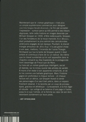Premier et unique roman graphique de William Gropper, Allez-hop ! s'inspire des oeuvres "sans paroles" de Masereel et de Ward, et de leur format d'une seule image par page. Il est probable que le roman graphique le plus vendu de Ward, God's Man (1929), ait été le catalyseur non seulement de Allez-hop ! , mais aussi de Deux manches et la Belle (La Table Ronde, 2019). Parus aux Etats-Unis la même année, ces deux livres sont dessinés avec la même énergie en apparence brouillonne, et sont pourtant d'une esthétique savamment construite. Dans Allez-hop ! se met en place un triangle amoureux formé par un duo d'acrobates au milieu duquel vient s'interposer un chanteur d'opéra. Ce dernier promet monts et merveilles à la femme, parvient à l'épouser, mais pas à évincer tout à fait l'homme acrobate, dont il devient horriblement jaloux... Un conte poignant et étonnamment moderne, aux rebondissements multiples. Alay-Oop (du français Allez hop), est en anglais un terme de basketball, qui désigne une variante du dunk.