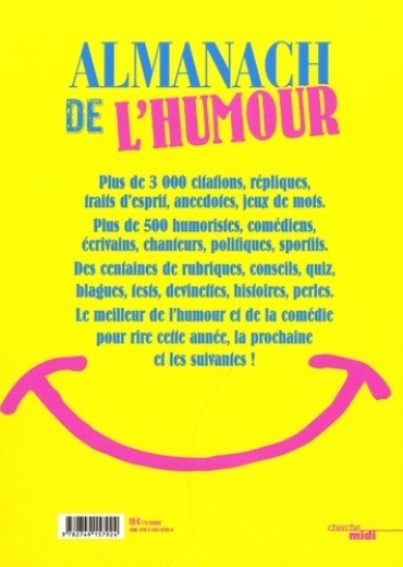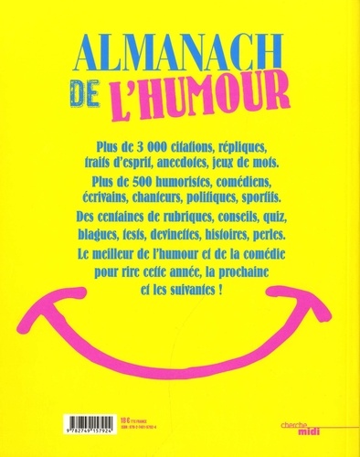 Plus de 3 000 citations, répliques, traits d'esprit, anecdotes, jeux de mots. Plus de 500 humoristes, comédiens, écrivains, chanteurs, politiques, sportifs. Des centaines de rubriques, conseils, quiz, blagues, tests, devinettes, histoires, perles. Le meilleur de l'humour et de la comédie pour rire cette année, la prochaine et les suivantes !