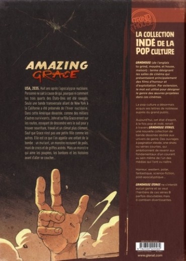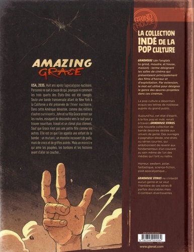 Le futur n'est pas pour les enfants sages USA, 2035. Huit ans après l'apocalypse nucléaire. Personne ne sait qui, pourquoi ou comment les trois quarts des Etats-Unis ont été ravagés. Seule une bande transversale allant de New York à la Californie a été préservée de l'hiver nucléaire. Dans cette Amérique dévastée, comme des milliers d'autres survivants, John et sa fille Grace errent sur les routes essayant de descendre vers le sud pour y trouver nourriture, travail et un climat plus clément. Sauf que Grace n'est pas une petite fille comme les autres. Elle est ce que l'on appelle une enfant de la bombe : un mutant, un monstre recouvert de poils, muni de crocs et de griffes acérées. Mais un monstre qui aime les poupées, les bonbons et les histoires avant d'aller se coucher. Alors qu'ils entendent parler d'un centre accueillant les enfants comme elle, John et Grace décident de mettre tout en oeuvre pour s'y rendre... et découvrir la réalité qui se cache derrière cette légende. Amazing Grace est à la fois un récit post apocalyptique explorant les restes d'une société détruite et le parcours initiatique d'une enfant en proie au rejet et à la différence. L'errance d'un père et sa fille dans une Amérique en ruine qui, par ses thématiques, n'est pas sans évoquer tant l'horreur que l'émotion sourde et poignante de La Route de Cormac McCarthy.