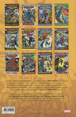 Timide, introverti et rejeté par ses camarades, le jeune Peter Parker se consacre à la science. Un jour, il prend part à une expérience qui bouleverse sa vie. Il se fait mordre par une araignée radioactive qui modifie son ADN et le dote de pouvoirs extraordinaires : force et agilité surhumaines, adhérence aux parois et un sixième sens qui l'alerte en cas de danger. Spider-Man est né ! Ce volume de SPIDER-MAN : L'INTEGRALE, brillamment orchestré par Stan Lee, John Romita Sr, Gil Kane, Roy Thomas et Gerry Conway, comprend l'intégralité de la production d'Amazing Spider-Man de 1972 et toutes les couvertures originales.