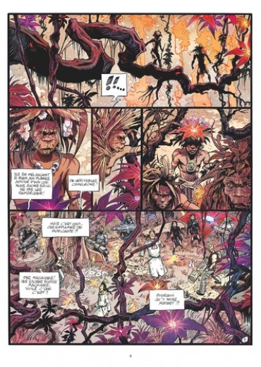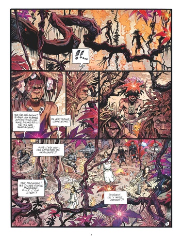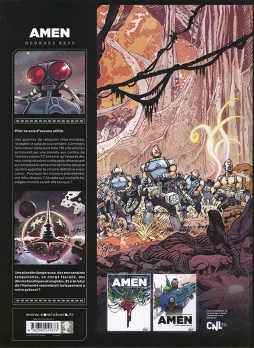 Prier ne sera d'aucune utilité. Tandis que d'interminables guerres de religions ravagent la galaxie tout entière, Arcadia cache de nombreux mystères... Et si la solution pour faire cesser cette pure folie guerrière se trouvait sur cette planète aux confins de l'univers connu ? Deux expéditions y ont déjà été envoyées par la Coalition mais aucune n'en est revenue. Pas un seul signe de vie n'a été relayé et aucune donnée n'a été transmise. Pourtant, Arcadia attire. Et une troisième expédition de néo-conquistadors vient d'y débarquer. Commanditée par Sir Raleigh et dirigée par son protégé Ishoa, elle est composée de quatre frères prêcheurs, de quantités de mercenaires - tous anciens forçats - et davantage encore d'esclaves-mutants et sherpas. Au programme : évangélisation de toute forme de vie consciente, annihilation d'espèces hostiles, recherche de richesses minières et enquête sur la disparition des deux précédentes expéditions. Mais dès la première journée d'exploration, d'inexplicables phénomènes laissent présager du pire concernant la destinée des précédents colons... Adaptation libre d'Au coeur des ténèbres de Joseph Conrad transposé dans contexte de guerre de religions interplanétaire, Amen est un exutoire graphique et narratif dont la ligne éditoriale décomplexée rappelle les meilleurs instants de Métal Hurlant. Dans les pages de ce premier tome d'un récit de science-fiction en deux parties, Georges Bess livre un space opera initiatique et décalé où s'entrechoquent délires fanatiques, complots politiques, violence et réflexion sociale. Où l'on en vient à se demander si le futur de l'Humanité imaginé là ne ressemblerait pas déjà quelque part à notre présent...