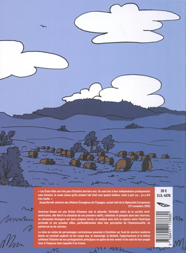 American Dream est une fiction d'humour noir et absurde mais à la fois révélatrice dans sa tentative de satire de la société nord-américaine. " Les Etats-Unis ont très peu d'histoire derrière eux. Ils sont nés à leur indépendance pratiquement sans histoire, la seule chose qu'ils avaient fait était tuer quatre indiens, mais à part ça... ça a été très facile. " Josep Borrell, ministre des affaires étrangères de l'Espagne, 27 novembre 2018 American Dream est une fiction d'humour noir et absurde mais à la fois révélatrice dans sa tentative de satire de la société nord-américaine, tant par sa description de la situation que vivent ses premiers natifs, colonisés et parqués dans des réserves, se retrouvant étrangers sur leurs propres terres, que par son analyse de la rupture entre l'Amérique profonde et ses grandes villes dans la perception de l'homosexualité, le patriarcat ou le racisme. La mise en scène de personnages caricaturaux poussés à l'extrême sur fond de western moderne donne un cocktail explosif où les coups bas, le mensonge, la lâcheté, l'opportunisme et la bêtise rythment l'histoire de nos protagonistes principaux (Castor Perplexe et Rosée de Printemps) en quête de leur avenir et celui de leur peuple face à l'impasse dans laquelle il se trouve.
