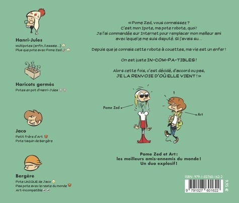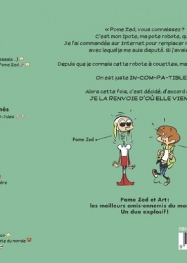 "Pome Zed, vous connaissez ? C'est mon Ipote, ma pote robote, quoi ! Je l'ai commandée sur Internet pour remplacer mon meilleur ami avec lequel je me suis disputé. Si j'avais su... Depuis que je connais cette robote à couettes, ma vie est un en fer ! On est juste IN-COM-PA-TIBLES ! Alors cette fois, c'est décidé, d'accord ou pas, JE LA RENVOIE D'OU ELLE VIENT ! " Pome Zed et Art : les meilleurs amis-ennemis du monde ! Un duo explosif !
