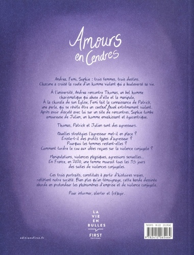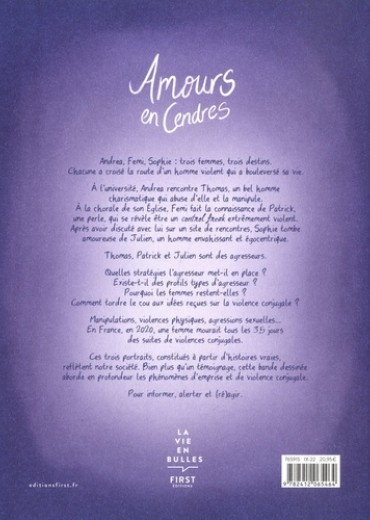Les destins croisés de 3 femmes victimes de violence conjugale Voici l'histoire de trois femmes qui ont subi des violences conjugales et qui finissent par partir de chez elles. Ces histoires sont fictives, mais reconstituées à partir de témoignages de femmes et d'histoires vraies qu'a recueillies l'autrice. Chaque histoire débute avec l'entretien de la femme et est racontée à la premiere personne, comme si elles lui racontaient ce qui leur est arrivé. Les histoires s'intercalent les unes aux autres mais les personnages ne se rencontrent pas. Environ tous les 15-20 pages, les récits seront ponctués de petites parties théoriques sur le mécanisme des violences conjugales. Elles apporteront une respiration au contenu du recit et permettront de prendre de la distance. Il y aura aussi quelques petites sequences ou l'on voit les femmes se rencontrer, dans le futur, dans une session de groupe de parole a une maison des femmes. Ces sequences servent aussi de respiration et pour montrer que les femmes se rencontreront a l'avenir.