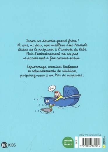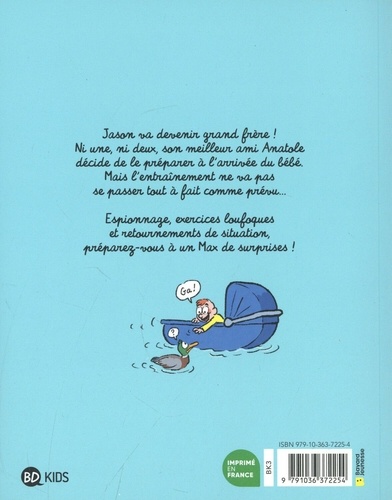 Jason va devenir grand frère ! Ni une, ni deux, son meilleur ami Anatole décide de le préparer à l'arrivée du bébé. Mais l'entraînement ne va pas se passer tout à fait comme prévu... Espionnage, exercices loufoques et retournements de situation, préparez-vous à un Max de surprises ! Un petit frère pour Jason Ce nouvel album aborde une thématique bien connue des jeunes lecteurs : l'arrivée d'un petit frère ou d'une petite soeur dans la famille. Avec beaucoup d'humour et tendresse, Jason, Anatole et leurs amis expérimentent ensemble cet évènement important. Un héros de presse en album Anatole est un héros multimédia que les lecteurs peuvent retrouver dans J'aime lire tous les mois, mais également à la télévision, en audio, en spectacle et dans des salles d'escape game !
