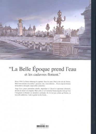 La Belle Epoque prend l'eau et les cadavres flottent. Hiver 1910. La Seine submerge la capitale. Sous les eaux, Paris a des airs de Venise. Mais tout remonte à la surface : passions, rats, vieux démons... Et un corps de femme démembré, mutilé et impossible à identifier. Ange Leca, jeune journaliste rebelle, dépendant à l'alcool et opiomane abstinent, décide de mener son enquête. Mais celle-ci va l'entraîner beaucoup plus loin qu'il ne l'imaginait et ébranler ses dernières certitudes. Et il n'est pas certain qu'Emma, sa nouvelle addiction, l'aide à garder la tête froide...