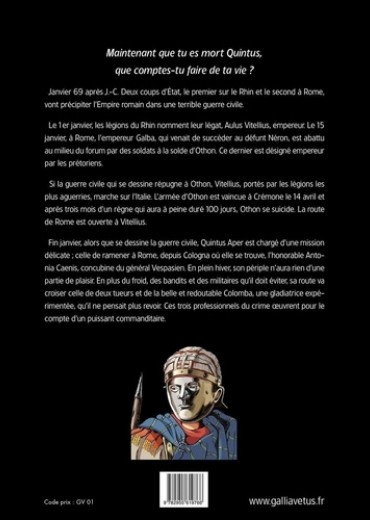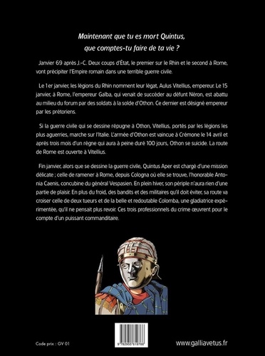 Janvier 69 après J. -C. Deux coups d'Etat, le premier sur le Rhin et le second à Rome, vont précipiter l'Empire romain dans une terrible guerre civile. Fin janvier, alors que se dessine la guerre civile, Quintus Aper est chargé d'une mission délicate , celle de ramener à Rome, depuis Cologna où elle se trouve, l'honorable Antonia Caenis, concubine du général Vespasien. En plein hiver, son périple n'aura rien d'une partie de plaisir. En plus du froid, des bandits et des militaires qu'il doit éviter, sa route va croiser celle de deux tueurs et de la belle et redoutable Colomba, une gladiatrice expérimentée, qu'il ne pensait plus revoir. Ces trois professionnels du crime oeuvrent pour le compte d'un puissant commanditaire.