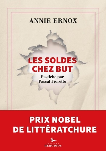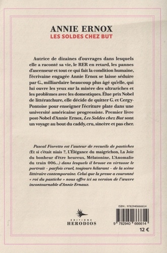 Autrice de dizaines d'ouvrages dans lesquels elle a raconté sa vie, le RER en retard, les palmes d'ascenseur et tout ce qui fait la condition humaine, l'écrivain engagée Annie Ernox se laisse séduire par G., milliardaire beaucoup plus âgé qu'elle, qui lui ouvre les yeux sur la misère des ultrariches et les problèmes avec les domestiques. Elue prix Nobel de littératchure, elle décide de quitter G. et Cergy-Pontoise pour enseigner l'écriture plate dans une université américaine progressiste. Premier livre post-Nobel d'Annie Ernox, Les Soldes chez But sont un voyage au bout du caddy, cru, sincère et pas cher. Pascal Fioretto est l'auteur de recueils de pastiches (Et si c'était niais ? , L'Elégance du maigrichon. La Joie du bonheur d'être heureux, Mélatonine, L'Anomalie du train 006...) dans lesquels il brosse en virtuose le portrait - parfois cruel toujours hilarant - de la scène littéraire contemporaine. Celui que la presse a couronné "roi du pastiche" nous offre ici sa version de l'oeuvre incontournable d'Annie Ernaur.
