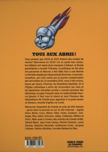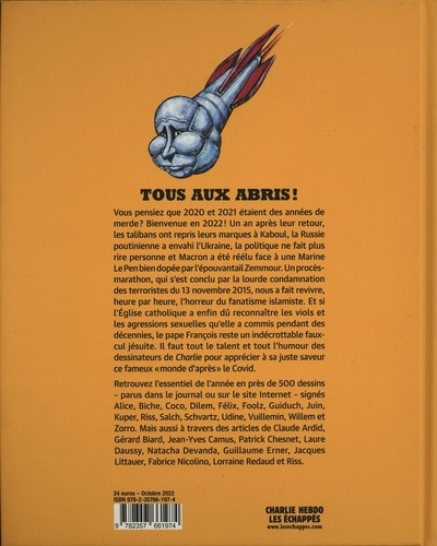 Retrouvez l'essentiel de l'actualité de l'année à travers les dessins et les articles de l'équipe de Charlie Hebdo ! Vous pensiez que 2020 et 2021 étaient des années de merde ? Bienvenue en 2022 ! Un an après leur retour, les talibans ont repris leurs marques à Kaboul, la Russie poutinienne a envahi l'Ukraine, la politique ne fait plus rire personne et Macron a été réélu face à une Marine Le Pen bien dopée par l'épouvantail Zemmour. Un procès- marathon, qui s'est conclu par la lourde condamnation des terroristes du 13 novembre 2015, nous a fait revivre, heure par heure, l'horreur du fanatisme islamiste. Et si l'Eglise catholique a enfin du^ reconnaître les viols et les agressions sexuelles qu'elle a commis pendant des décennies, le pape Franc ? ois reste un indécrottable faux- cul jésuite. Il faut tout le talent et tout l'humour des dessinateurs de Charlie pour apprécier à sa juste saveur ce fameux " monde d'après " le Covid.