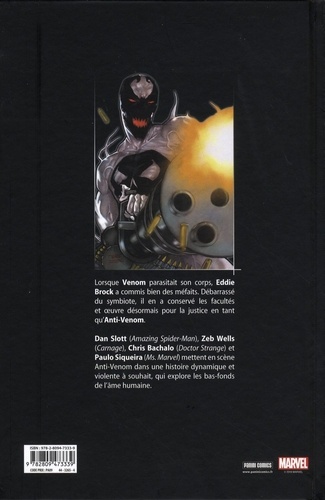 Lorsque Venom parasitait son corps, Eddie Brock a commis bien des méfaits. Débarrassé du symbiote, il en a conservé les facultés et oeuvre désormais pour la justice en tant qu'Anti-Venom. Dan Slott (Amazing Spider-Man), Zeb Wells (Carnage), Chris Bachalo (Doctor Strange) et Paulo Siqueira (Ms. Marvel) mettent en scène Anti-Venom dans une histoire dynamique et violente à souhait, qui explore les bas-fonds de l'âme humaine.