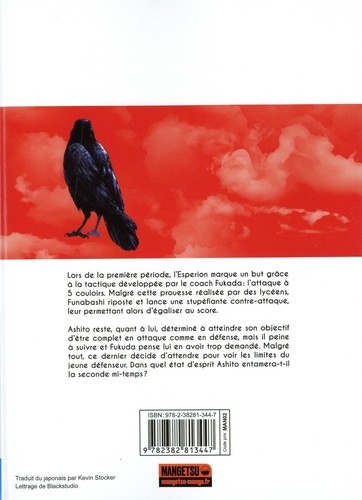 Lors de la première période, l'Esperion marque un but grâce à la tactique développée par le coach Fukuda : l'attaque à 5 couloirs. Malgré cette prouesse réalisée par des lycéens, Funabashi riposte et lance une stupéfiante contre-attaque, leur permettant alors d'égaliser au score. Ashito reste, quant à lui, déterminé à atteindre son objectif d'être complet en attaque comme en défense, mais il peine à suivre et Fukuda pense lui en avoir trop demandé. Malgré tout, ce dernier décide d'attendre pour voir les limites du jeune défenseur. Dans quel état d'esprit Ashito entamera-t-il la seconde mi-temps ? Ecrit et dessiné par Yûgo Kobayashi et édité depuis 2015 par Shogakukan au Japon, Ao Ashi a remporté la 65e édition des Manga Awards en 2019, une des récompenses les plus prestigieuses du monde de la bande dessinée dans l'archipel. En 2022, une adaptation animée est réalisée par les célèbres studios Production I. G. A mi-chemin entre le shônen sur le terrain et le seinen en dehors, Ao Ashi fait d'ores et déjà partie du cercle très fermé des plus grands mangas de sport, grâce à l'écriture incisive et hyper dynamique de son auteur, et aux tempéraments hauts en couleur de sa galerie de personnages, à commencer par Ashito, son inoubliable héros.