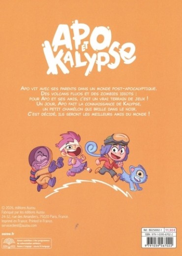 Apo est un petit garçon qui vit dans un monde post-apocalyptique très rigolo ! Des volcans fluos, des zombies idiots et des bêtises à gogo ! Apo vit avec ses parents dans un monde post-apocalyptique. La vie est de nouveau possible mais tout a changé. La végétation est un peu farfelue, il y a des cratères et des volcans un peu partout et quelques zombies idiots traînent dans les coins. Pour Apo et ses amis, c'est un vrai terrain de jeux ! Surtout qu'il n'y a pas école depuis belle lurette. Un jour Apo fait la connaissance de Kalypse, un petit chamélon qui brille dans le noir. C'est décidé, Apo et Kalypse seront les meilleurs amis du monde !