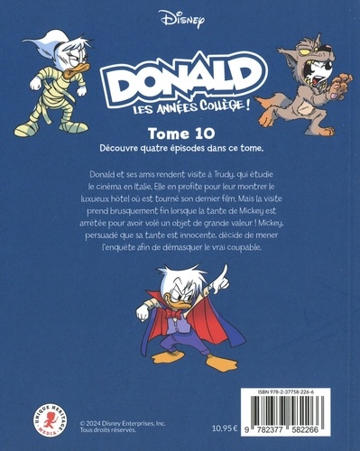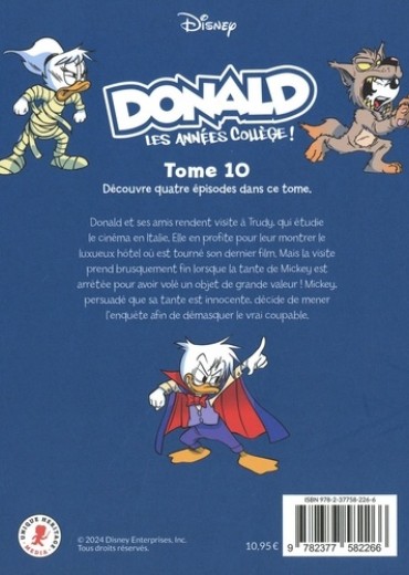 Découvrez le dixième tome des aventures délirantes de Donald et ses amis durant leurs années collège ! Cette bande dessinée de 96 pages comprend une présentation des personnages et 4 épisodes. A lire dès 7 ans. Donald et ses amis rendent visite à Trudy, qui étudie le cinéma en Italie. Elle en profite pour leur montrer le luxueux hôtel où est tourné son dernier film. Mais la visite prend brusquement fin lorsque la tante de Mickey est arrêtée pour avoir volé un objet de grande valeur ! Mickey, persuadé que sa tante est innocente, décide de mener l'enquête afin de démasquer le vrai coupable.