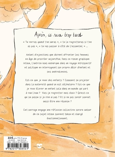 "Tu verras quand t'en auras", "tu le regretteras si t'en as pas", "tu vas passer à côté de l'essentiel" ... Autant d'injonctions que doivent affronter les femmes en âge de procéer aujourd'hui. Dans ce roman graphique intime, l'autrice nous embarque dans un voyage introspectif et politique en interrogeant son propre désir d'enfant et ses ambivalences. Est-ce que je veux des enfants ? Comment se projeter dans la maternité quand on est célibataire ? Est-ce que je veux élever un enfant solo dans un monde qui part à vau l'eau ? Vais-je regretter mes choix ? Et si ne pas savoir pouvait aussi être une réponse ? Cet ouvrage engage une réflexion collective sorore autour de ce sujet intime souvent tabou et chargé émotionnellement.