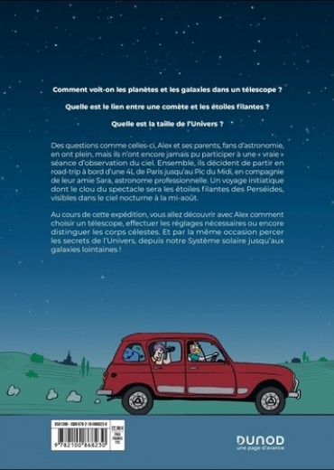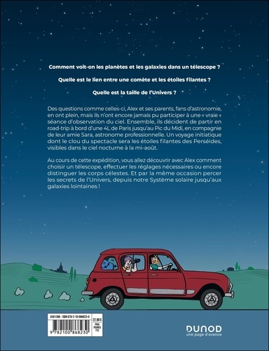 Comment observer des planètes et des galaxies avec un télescope ? Quelle est le lien entre une comète et les étoiles filantes ? Quelle est la taille de l'Univers ? Des questions comme celles-ci, Alex et ses parents, fans d'astronomie, en ont plein, mais ils n'ont encore jamais pu participer à une " vraie " séance d'observation du ciel. Ensemble, ils décident de partir en road-trip à bord d'une 4L de Paris jusqu'au Pic du Midi, en compagnie de leur amie Sara, astronome professionnelle. Un voyage initiatique dont le clou du spectacle sera les étoiles filantes des Perséides, visibles dans le ciel nocturne à la mi-août. Au cours de cette expédition, vous allez découvrir avec Alex comment choisir un télescope, effectuer les réglages nécessaires ou encore distinguer les corps célestes. Et par la même occasion percer les secrets de l'Univers, depuis notre Système solaire jusqu'aux galaxies lointaines !