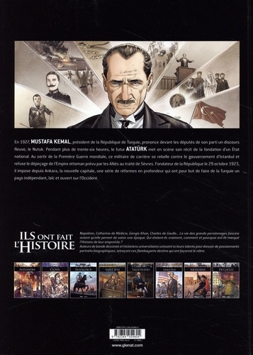 Le "père des Turcs", héros de la Turquie moderne Le 15 octobre 1927, Mustafa Kemal, président de la République turque, entame un très long discours : le Nutuk. Il expose dans cette allocution qui dure près de six journées pleines son récit de la fondation de la Turquie moderne. Après la Première Guerre mondiale, Mustafa Kemal, alors militaire de carrière, refuse le dépeçage de l'Empire ottoman prévu par les Alliés au traité de Sèvres et mène une révolte contre le gouvernement d'Istanbul. Après sa victoire contre les Grecs à l'ouest de l'Anatolie puis l'abolition du sultanat ottoman par la Grande Assemblée nationale de Turquie, il proclame la République le 29 octobre 1923. Depuis Ankara, nouvelle capitale de la Turquie, Kemal impose alors des réformes fondamentales, basées sur l'indépendance et la laïcité, afin de bâtir une nation turque foncièrement homogène sur les ruines de l'Empire ottoman multiculturel. Marie Bardiaux-Vaïente et Andrea Meloni, s'appuyant sur les connaissances éclairées de l'historien François Georgeon, nous racontent comment un militaire nourri de culture occidentale et d'une énergie peu commune, Mustafa Kemal, permit à la Turquie d'entrer dans l'ère moderne. Un personnage autoritaire, désigné Atatürk ("le Turc-Père") par la Grande Assemblée, qui reste aujourd'hui encore la grande figure tutélaire de la Turquie autant que l'un des hommes politiques les plus remarquables de la période de l'entre-deux-guerres.