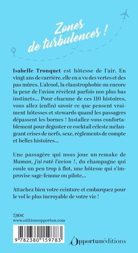 Isabelle Tronquet est hôtesse de l'air. En vingt ans de carrière, elle en a vu des vertes et des pas mûres. L'alcool, la claustrophobie ou encore la peur de l'avion révèlent parfois nos plus bas instincts... Pour chacune de ces 110 histoires, vous allez (enfin) savoir ce que pensent vraiment hôtesses et stewards quand les passagers dépassent les bornes ! Installez-vous confortablement pour déguster ce cocktail céleste mélangeant crises de nerfs, sexe, règlements de compte et belles histoires...