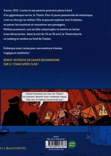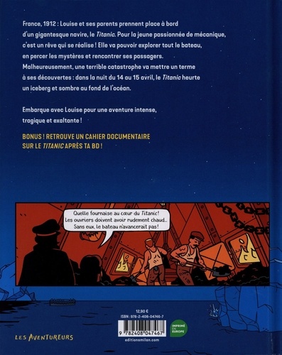 Le titanic, une bande dessinée de la nouvelle collection "Les aventureurs", à partir de 7 ans ! France, 1912. Louise est tout excitée : sa famille a pris la décision de quitter la France, direction les Etats-Unis et leurs promesses de nouvelle vie ! Mieux encore pour la petite passionnée de mécanique : ils vont traverser l'Atlantique à bord d'un gigantesque navire, le "Titanic" ! Louise est bien décidée à explorer tout le bateau - ses ponts, ses chaufferies, ses restaurants ou encore sa salle de radio - mais aussi à rencontrer le maximum de passagers. Très vite, elle va se lier d'amitié avec Hannah, une Allemande qui lui ressemble comme deux gouttes d'eau et qui va lui permettre de découvrir le luxe de la première classe. Mais une tragédie met un terme à ses découvertes : le 14 avril, en pleine nuit, le "Titanic" heurte un iceberg et, en quelques heures, s'enfonce définitivement dans les flots. Notre héroïne réussit à monter sur un bateau, mais ce drame marquera profondément l'Histoire comme la culture populaire. Ce nouveau tome de la collection "Les aventureurs" est l'occasion de revenir sur cet événement, mais aussi sur le contexte social, technique et politique de l'époque : à la hauteur du regard de la jeune Louise, tous les mystères du "Titanic" se dévoilent pour les lecteurs et les petits passionnés.
