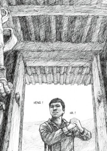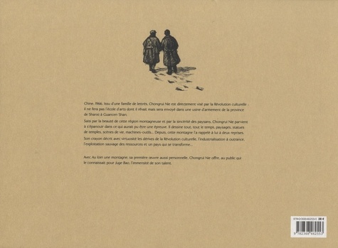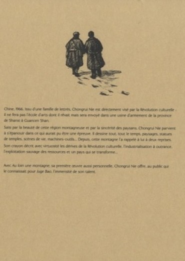 Chine. 1966. Issu d'une famille de lettrés. Chongrui Nie est directement vise parla Révolution culturelle il ne fera pas récole d'arts dont il rêvait mais sera envoyé dans une usine d'armement de la province de Shanxi à Guancen Shan. Saisi par la beauté de cette région montagneuse et par la sincérité des paysans. Chongrui Nie parvient a s'épanouir dans ce qui aurait pu être une épreuve. Il dessine tout, tout le temps. paysages. statues de temples. scènes de vie. machines-outils... Depuis, cette montagne l'a rappelé à lui à deux reprises. Son crayon décrit avec virtuosité les dérives de la Révolution culturelle. l'industrialisation à outrance. exploitation sauvage des ressources et un pays gui se transforme... Avec Au loin une montagne. sa première ouvre aussi personnelle. Chongrui Nie offre au public qui le connaissait pour Juge Bao, l'immensité de son talent.