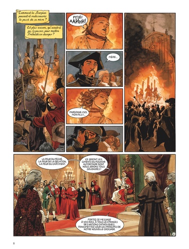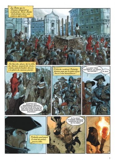 Rentrés secrètement à Rome sans la vraie croix de Saint Pierre, preuve essentielle de l'illégitimité de l'élection du cardinal Trebaldi à la papauté, le Scorpion, son ami le hussard et la gitane Méjaï découvrent une ville où, plus que jamais pressé d'effacer toutes traces de son passé, le nouveau pontife fait régner la terreur avec la complicité du Grand Inquisiteur, de la police implacable des moines guerriers et de dénonciateurs espérant sauver leur vie. Partout, des bûchers se dressent sur lesquels périssent les opposants avérés ou présumés. Un seul dignitaire de l'Eglise ose résister à la tyrannie de Trebaldi : le cardinal de Curtis. Mais pour combien de temps encore ? L'obsession du Scorpion est toujours de dénoncer l'imposture qui a permis l'accession de Trebaldi au trône pontifical. Selon le cardinal rebelle de Curtis, il trouvera les preuves accusatrices dont il a besoin dans les obscures raisons de la condamnation de sa mère pour sorcellerie. Cette révélation incite plus que jamais le Scorpion à percer le mystère de ses origines. Par qui et pourquoi l'exécution de sa mère a-t-elle été commandée ? L'exécuteur serait-il son père ? Tandis que le cardinal de Curtis cherche les réponses dans les archives du Vatican, le Scorpion et ses amis s'efforcent de faire parler les rares témoins des événements qui ont mené au procès et à la condamnation de sa mère. L'implication de Trebaldi dans cette sombre affaire se révèle cruellement déterminante... Premier tome du second cycle.