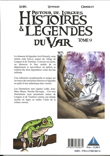 Le chasseur de Légendes Axel Graisely, nous amène cette fois-ci, autour du village de Lorgues et de Tourtour. A travers ces récits, on découvre la face cachée de ce département si merveilleux où parfois se cachent des êtres légendaires venus des bas tréfonds. Une collection exceptionnelle et unique sur les traces des anciennes histoires et légendes en quête d'une authentique âme varoise. Les illustrations sont signées LoBé, Jean-Marc Mayer, Nicolas Devergie... Ces trois illustrateurs nous promènent autour de Lorgues et de Tourtour comme une balade secrète où règne en maître l'écho de la culture varoise... .