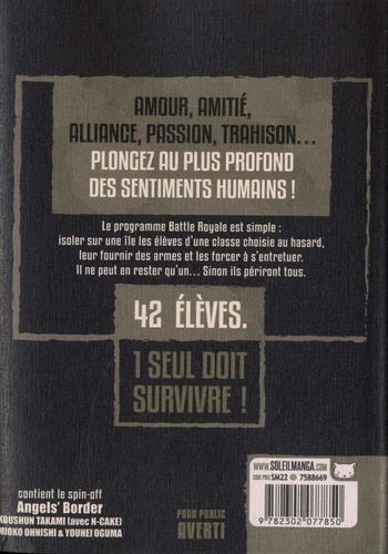 La référence du survival game à la japonaise, devenue un véritable classique du genre, revient dans une Ultimate Edition ! La république d'Extrême Orient, nation totalitaire d'Asie, expérimente un jeu de massacre appelé " le programme ". Des classes de 3e année sont choisies arbitrairement pour y participer. Les élèves d'une même classe doivent s'entretuer jusqu'à ce qu'il ne reste plus qu'un seul survivant. Telle en est la cruelle règle. Les 42 élèves de la classe de 3 - B du collège Shiroiwa se retrouvent engagés dans ce véritable " jeu de la mort ", sans même savoir pourquoi...