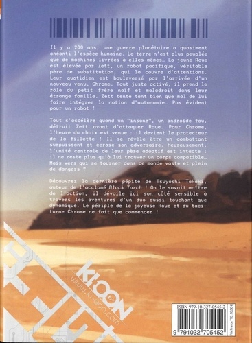 Il y a 200 ans, une guerre planétaire a quasiment anéanti l'espèce humaine. La terre n'est plus peuplée que de machines livrées à elles-mêmes... La jeune Roue est élevée por Zett, un robot pacifique, véritable père de substitution, qui la couvre d'attentions. Leur quotidien est bouleversé par l'arrivée d'un nouveau venu, Chrome. Tout juste activé, il prend le rôle du petit frère naïf et maladroit dans leur étrange famille. Zett tente tant bien que mal de lui faire intégrer la notion d'autonomie... Pas évident pour un robot ! Tout s'accélère quand un "insane", un androïde fou, détruit Zett avant d'attaquer Roue. Pour Chrome, l'heure du choix est venue il devient le protecteur de la fillette ! Il se révèle être un combattant surpuissant et écrase son adversaire. Heureusement, l'unité centrale de leur père adoptif est intacte il ne reste plus qu'à lui trouver un corps compatible... Mais vers qui se tourner dans ce monde vaste et plein de dangers ?