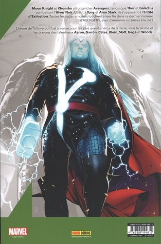 Moon Knight et Khonshu affrontent les Avengers, tandis que Thor et Galactus combattent l'Hiver Noir. Quant à Tony et Arno Stark, ils s'opposent à l'Entité d'Extinction. Toutes les sagas en cours touchent à leur fin dans ce dernier numéro d'AVENGERS, avec d'énormes surprises à la clé L'heure de l'ultime combat a sonné pour les plus grands héros de la Terre, sous la plume et les crayons des talentueux Aaron, Garrôn, Cates, Klein, Slott, Gage et Woods.