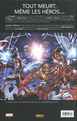 Thanos et la Cabale détruisent des versions parallèles de la Terre et leurs univers avec ! Mais que peuvent faire les Avengers alors qu'ils sont désorganisés, brouillés, et que mettre fin au massacre de la Cabale pourrait signer la mort de notre réalité ? Le salut peut-il venir du Docteur Fatalis ? Toutes les trames tissées par Jonathan Hickman depuis le début des séries Avengers et New Avengers (rééditées récemment en MARVEL DELUXE) trouvent leur conclusion ici, avec un affrontement décisif entre les Avengers et Thanos, et un autre encore plus essentiel entre Fatalis et les Beyonders. Les événements de ce volume débouchent sur la saga Secret Wars.