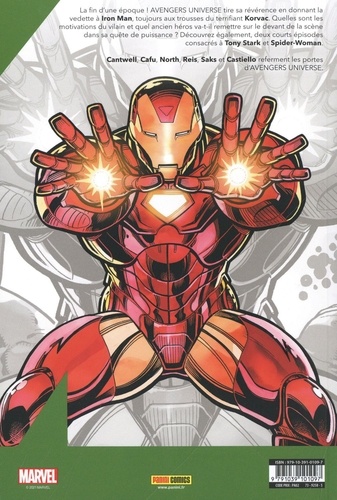 La fin d'une époque ! Avengers Universe tire sa révérence en donnant la vedette à Iron Man, toujours aux trousses du terrifiant Korvac. Quelles sont les motivations du vilain et quel ancien héros va-t-il remettre sur le devant de la scène dans sa quête de puissance ? Découvrez également, deux courts épisodes consacrés à Tony Stark et Spider-Woman. Cantwell, Cafu, North Reis, Saks et Castiello referment les portes d'Avengers Universe.
