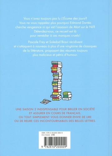 Vous n'avez toujours pas lu L'Ecume des jours ? Vous ne vous rappelez plus pourquoi Edmond Dantès cherche vengeance ni qui est l'assassin de Mort sur le Nil ? Détendez-vous, ce recueil est là pour remédier à ces manques cruels ! Pascale Frey et Soledad Bravi récidivent t s'attaquent à nouveau à plus d'une vingtaine de classiques la littérature, proposant des résumés toujours plus malicieux et pétris d'humour. Une saison 2 indispensable pour briller en société et assurer en cours de français, ou tout simplement vous donner envie de lire ou de relire ces incontournables des belles lettres.