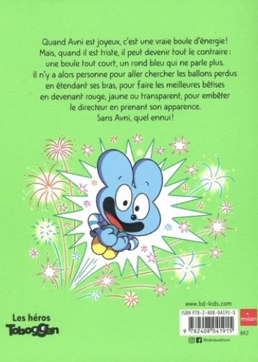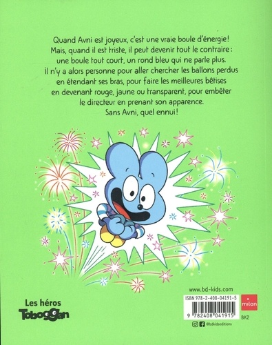 Avni est une vraie boule d'énergie : c'est toujours le premier pour jouer, courir, sauter, aller chercher les ballons envoyés par erreur dans les arbres, se transformer en tout et n'importe quoi et faire des bêtises pour animer la cour de récré. Il est difficile à rater ! Au point que ça peut parfois énerver un peu ses amis et parents, qui ne se privent pas toujours de lui dire. Alors, parfois, Avni se vexe. Et cette fois-ci, ça n'est pas rien : de boule d'énergie, il est devenu... une boule tout court. Un rond bleu inanimé, beaucoup moins marrant qu'Avni ! A présent, il n'y a plus personne pour aller chercher les ballons envoyés par erreur dans les arbres, se transformer en tout et n'importe quoi et faire des bêtises pour animer la cour de récré. Tout le monde s'ennuie d'Avni et s'inquiète... mais quand reviendra-t-il ? Heureusement, quand il s'agit de s'amuser, Avni n'est jamais le dernier, et ses amis le savent bien ! Un 9e tome attendu pour le héros bleu aux incroyables pouvoirs, qui réunit de nombreux gags parus dans le magazine Toboggan, et autant d'inédits.
