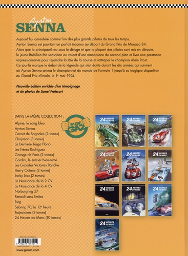 Trajectoire d'une légende Lors du Grand Prix de Monaco 84, un jeune pilote au casque jaune fait sensation. Alors que le déluge s'abat sur la principauté et que la plupart des pilotes sont mis en déroute, le jeune brésilien au volant de sa modeste Toleman livre une prestation impressionnante jusqu'à revenir dans les roues du leader Alain Prost. Même si le champion français remporte finalement la course d'une petite longueur, Ayrton Senna est le vainqueur médiatique. C'est le début d'une légende ; celle de celui qui sera 3 fois champion du monde avant de perdre la vie sur le circuit d'Imola le 1er mai 1994 et qui est considéré aujourd'hui comme l'un des plus grands pilotes de tous les temps. A l'occasion du trentième anniversaire de sa disparition, la collection "Plein Gaz" propose une nouvelle édition du biopic en BD d'Ayrton Senna enrichie de 8 pages de témoignages et de photographies de Lionel Froissart, journaliste spécialisé qui a côtoyé le champion durant toute sa carrière.