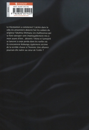 Le Hiemontori a commencé ! Lâchés dans la ville, les prisonniers doivent fuir les soldats du seigneur Takahisa Shimazu. Les malheureux qui se font rattraper sont impitoyablement mis à mort avant d'être... dévorés ! Shino et Samojirô se lancent à corps perdu dans les ruelles où ils rencontrent Kobungo, lui aussi victime de cette terrible chasse à l'homme. Une alliance pourrait-elle naître au coeur de cet enfer ?